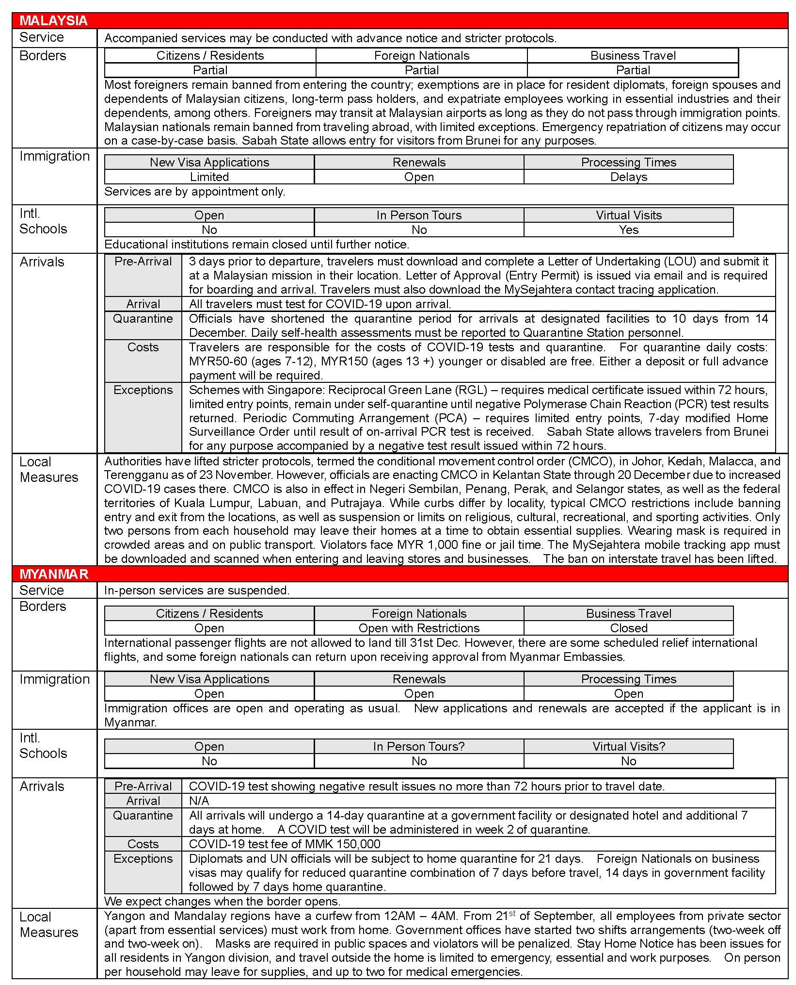 This report will be paused, however, we will continue to monitor any changes that may impact global mobility. Minor updates will be posted to our blog: https://www.relonetworkasia.com/blog/covid-19-ongoing-report/ and shared on social media. In the case of a critical change before the next regular report due on January 7th, we will also send an email summary to this distribution list.